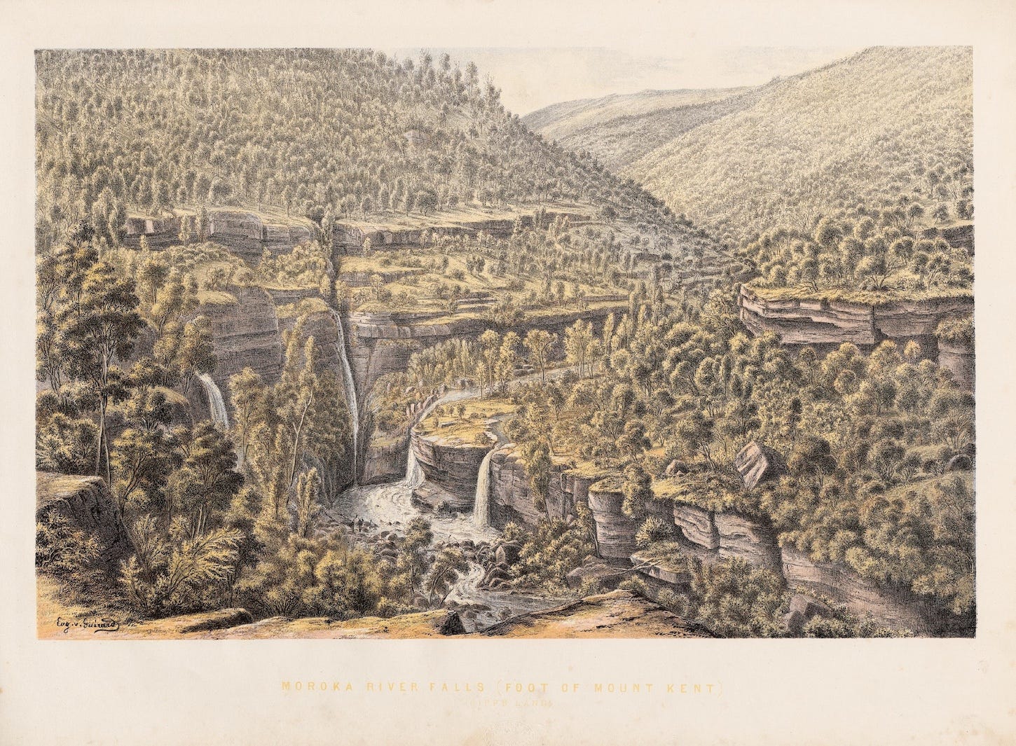 Eugène von Guérard, Moroka River Falls (foot of Mount Kent), Gipps Land [sic], plate 19 from Australian Landscapes: A Series of 24 Tinted Lithographs (Melbourne, 1866–68).*